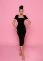 A gorgeous midi dress by Nicoletta NP160. A flattering style with a square neckline, short sleeves and accentuating shoulder pads.