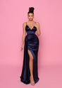 A gorgeous full length dress by Nicoletta NP162. A flattering style featuring ruching, draped panel and spaghetti straps.