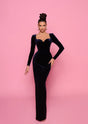 A gorgeous full length dress by Nicoletta NP169. A sleeved style featuring a sweetheart neckline and crafted in a velvet fabric.