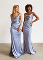 Embrace timeless elegance with the Nemesia Bridesmaid Dress, crafted from luxurious stretch satin. Offered in stunning shades such as Marine, Black, Champagne, and more, its draped cowl bodice and wide-set straps radiate sophistication. Pin tuck detailing sculpts a flattering silhouette, while a side slit adds a touch of allure.