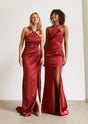 Elevate your bridal party’s style with the Osiria Bridesmaid Dress, a perfect fusion of sophistication and contemporary flair. Made from luxurious stretch satin, this floor-length gown features a sleek halter neckline, pin tuck detailing at the waist that sculpts a flattering silhouette, and a modern side slit for effortless movement.