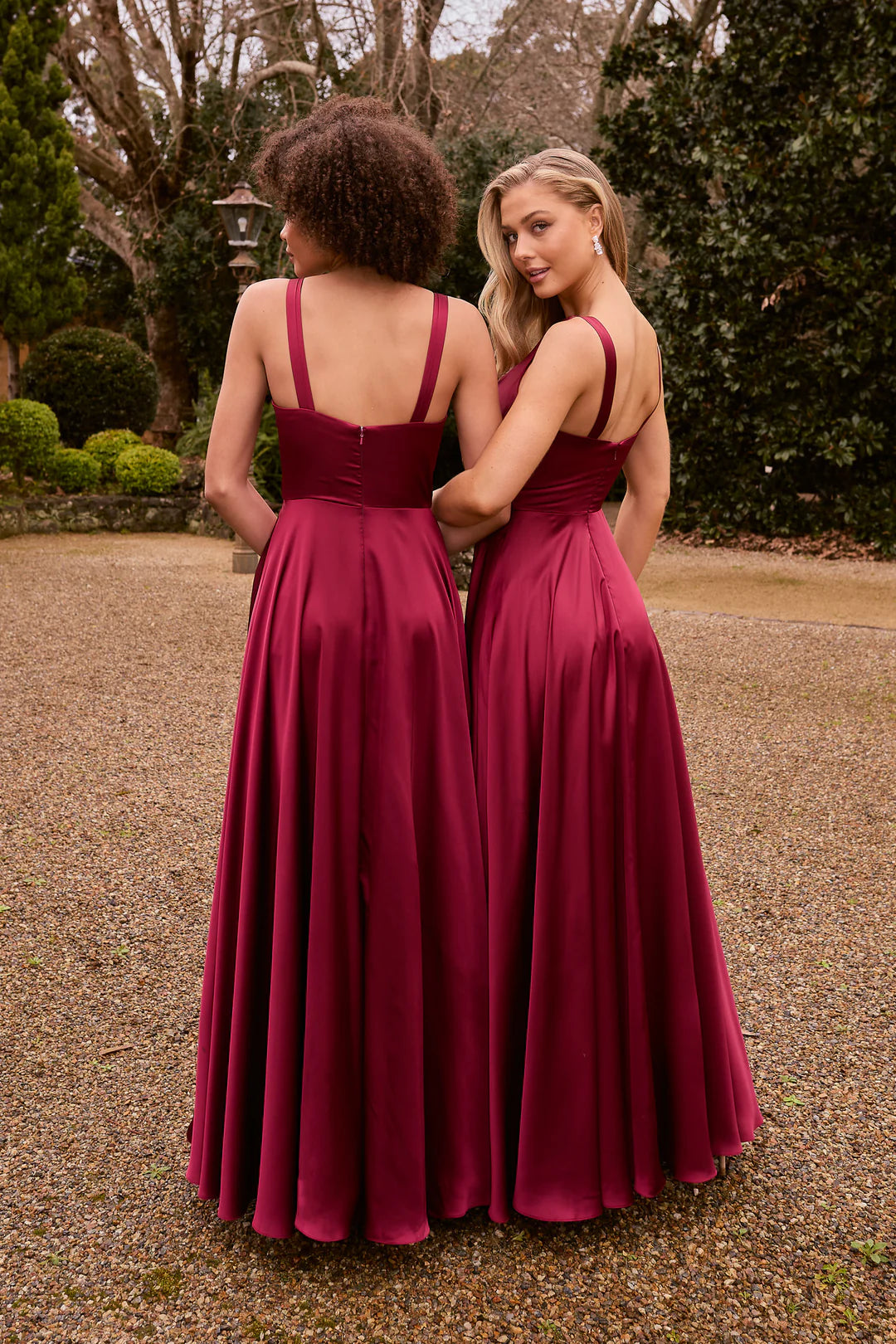 Introducing the Marseille bridesmaid dress, a beautiful blend of elegance and comfort. Crafted from lightweight satin, this gown features a corset-style bodice with cross-over ruching designed to flatter and define the waist.
