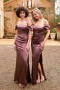 The strapless design is complemented by off-the-shoulder sleeves, creating a romantic frame for the shoulders. Its fitted silhouette flatters the figure, enhanced by ruching across the bodice that adds depth and visual appeal.