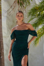 The bodice features a cowl front neckline, exuding a touch of sophistication, and is paired with draped off-the-shoulder detachable sleeves for added versatility. The fitted mermaid silhouette enhances your curves, with a side leg split and draping across the hips that adds an element of allure.