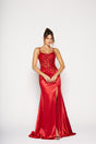 Introducing the Gal formal dress – a captivating slinky fit and flair gown. Crafted from a combination of luxurious stretch satin and delicate lace appliqué, this dress is the epitome of elegance.