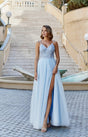 The Rue PO950 by Tania Olsen Designs is fit for a princess. The bodice is laden with pale blue, Champagne and white beads which create an intricate, ornate pattern. The spaghetti straps are covered in rhinestones, and meet a low, mostly open v back. This A-Line silhouette design is crafted from a glitter tulle fabric which both sits beautifully on the body, and allows the skirt to move effortlessly on the dance floor.