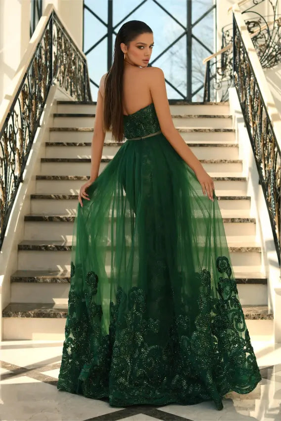 Turn heads in the breathtaking NC1003 by Nicoletta, a timeless design perfect for your most special occasions. Featuring a structured boned corset with a sweetheart neckline, this gown offers a flattering, secure fit that accentuates the waist. Delicate lace and intricate beading elegantly trace the silhouette, while the detachable overskirt adds a dreamy, ethereal touch. A truly captivating piece for evening glamour.