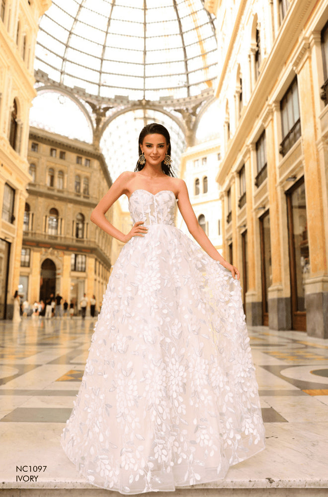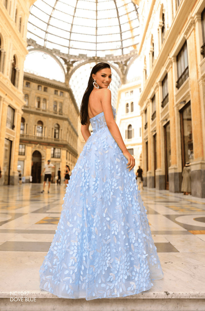 Make an unforgettable entrance in the NC1097 by Nicoletta. This strapless design features a sweetheart neckline, a structured corset-like bodice, and a padded bust that enhances your shape with elegance and allure. The delicate 3D floral appliqué on the tulle overlay adds a touch of romantic charm, while the fully-lined A-line skirt, complete with a petticoat, creates a voluminous and graceful look. Perfect for any memorable evening, this gown ensures you’ll feel like the belle of the ball.