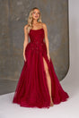 Introducing the Paris dress, a stunning fusion of elegance and intricate detailing. This captivating piece features an illusion bodice with a graceful scoop neckline, accented by delicate straps adorned with lace applique. The corset-style design includes boning for added structure, complemented by mini tulle ruching detail on the front bodice for a touch of texture. Built-in bra cups provide support and comfort, ensuring a flattering fit. An invisible zipper with a hook-and-eye closure and lace-up back offers a secure fit, while the lace appliquŽ detailing on both the front bodice and skirt enhances its romantic appeal. The full A-line skirt, lined in satin and featuring a glitter tulle overlay, flows beautifully and features an overlay thigh-high front leg split for added allure. The Vanessa dress is the perfect choice for any formal occasion, blending timeless beauty with modern sophistication.