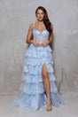 This stunning gown features a fitted bodice adorned with intricate floral appliqué, elicately embellished with iridescent sequins. The strappy lace-up back adds a touch of elegance and allure. Its layered, tiered skirt creates a voluminous, dreamy silhouette, complete with a thigh-high slit for a modern twist. The dress is perfect for any formal occasion, combining a romantic, ethereal feel with a hint of bold sophistication. The model pairs the look with statement earrings, enhancing the overall glamorous aesthetic.