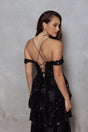 This stunning black gown exudes elegance with its intricate lace-up back design and shimmering sequins. The gown features off-the-shoulder straps and a sweetheart neckline, offering a flattering silhouette. Its tiered, ruffled skirt adds a dramatic flair, while a front slit provides both sophistication and ease of movement. Perfect for formal events or evening occasions, this gown is sure to make a lasting impression with its blend of glamour and timeless style.